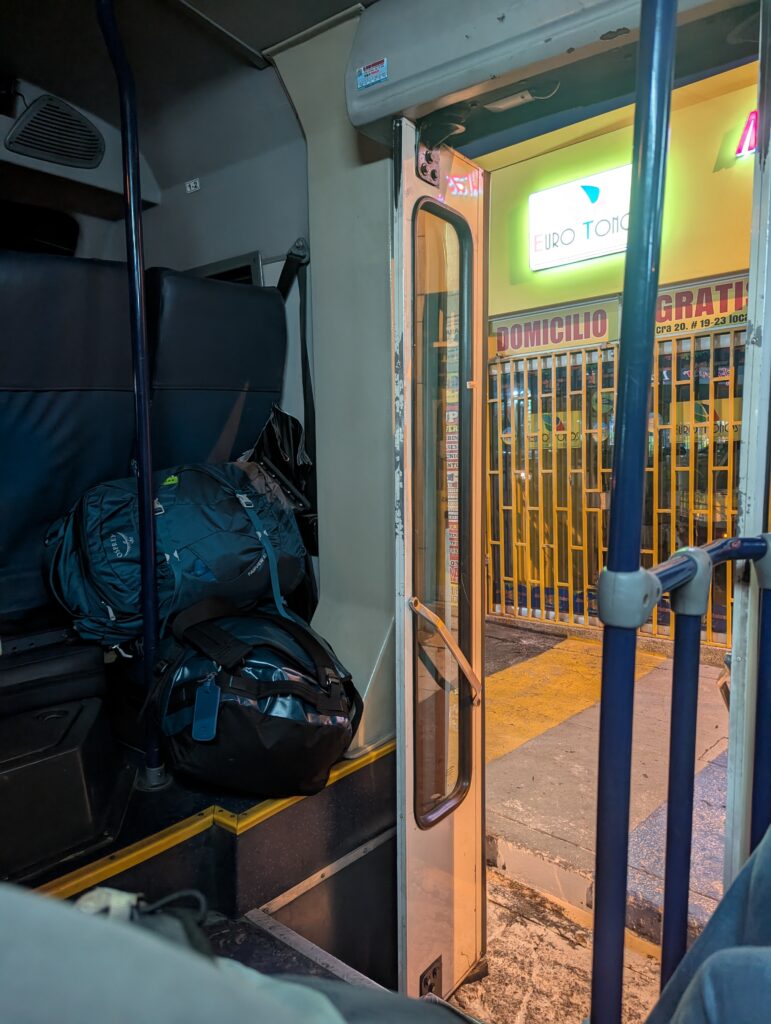 We changed from our VIP bus to a (very) local ‘buseta’ in Armenia. The driver of the ‘buseta’ was incredibly enthusiastic, he had no doubts our bags would fit on and helped us cram the bags behind a pole next to the door. He was totally confident the bags would remain on the bus, we were less assured, and watched dutifully as he drove for the first 5 minutes with the doors actually open just to add to the jeopardy.
